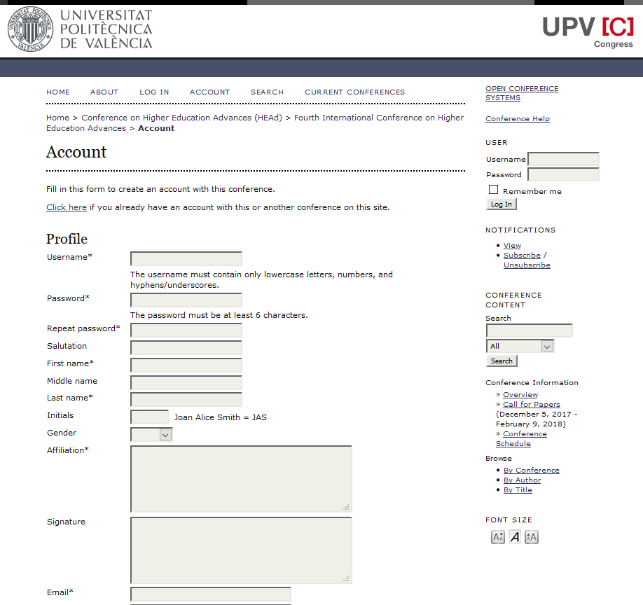 (You can skip this step if you already have an account on UPV’s OCS. If this is the case, click on this link and then on “Click here if you already have an account with this or another conference in this site”. Then, you will be redirected to a screen for entering HEAd’25 OCS with your already existing credentials.)