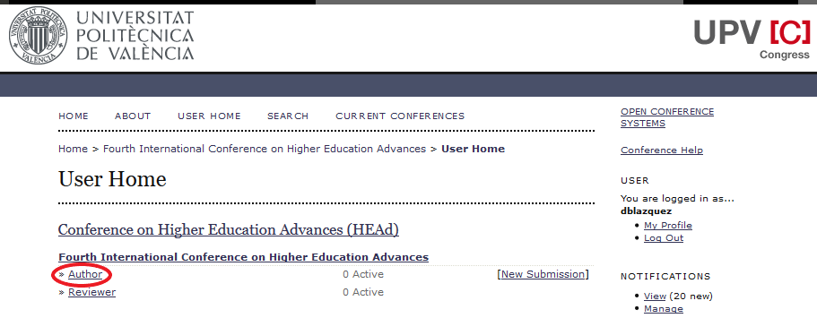 Under the name of the conference, Eleventh International Conference on Higher Education Advances (HEAd’25), click on “Author” to access the screen with a list of your active submissions. Alternatively, you can follow this link: http://ocs.editorial.upv.es/index.php/HEAD/HEAd25/author