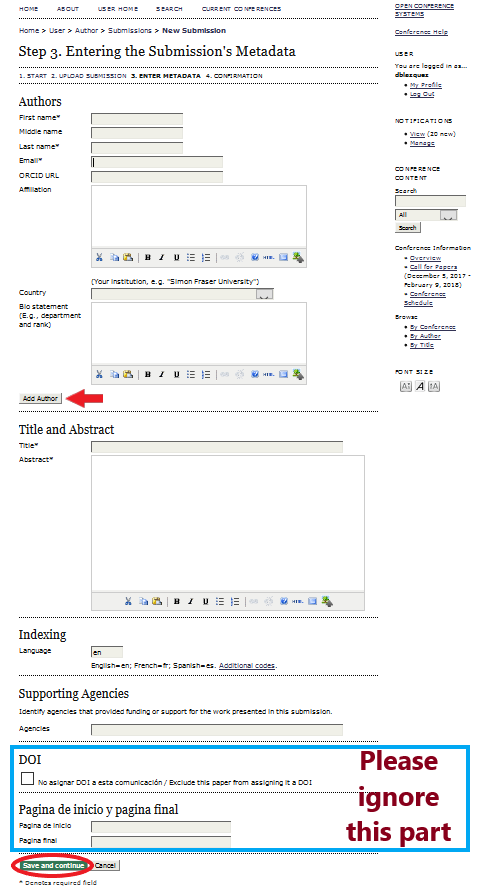 The third step consists of entering detailed information about the authors and the paper. Please, remember to include the details for all the authors of the paper (click on “Add Author” after each author’s details are completed).