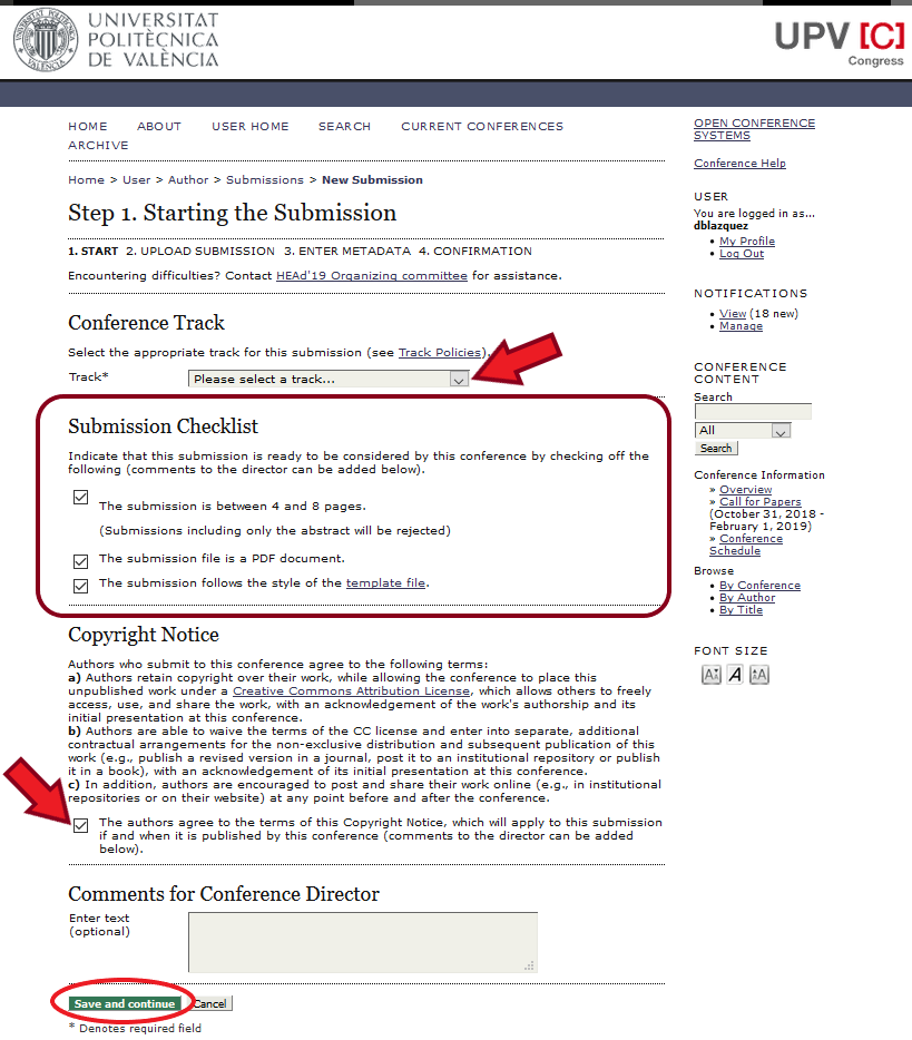 Select a track for your paper, complete the submission checklist, read and accept the copyright notice and save all changes.